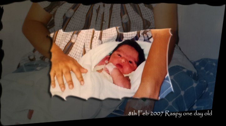 The D-day was tensed. Raji arrived in Bangalore early morning on the 6th of Feb 2007 from Kolkata and I had to be admitted to the hospital that very night. Raspy’s position suggested that he was due to eject normally by early morning next day. But all the drips and meds could not bring raspy out on his own so the doc had to operate and push and then I heard her say – cried instantly at birth, 3kgs, boy baby.