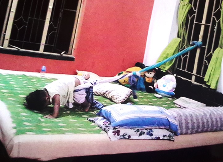 He could attain and sustain a crawling position for a few seconds and jump like a frog on all four, he could not crawl. He could bring himself to a 120° obtuse angle position that’s nearly a sitting posture.