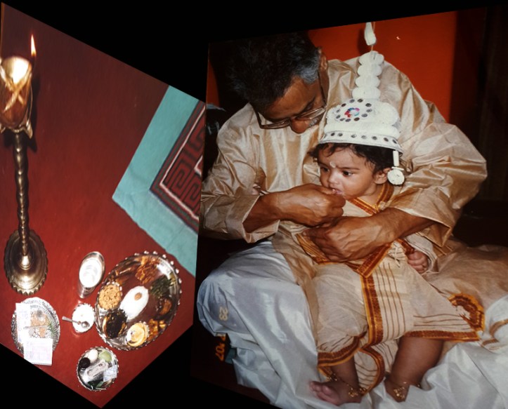 According to rituals my brother should feed the first solid food but since I have none of my own and lots of cousins on the contrary, dad did the honours.
